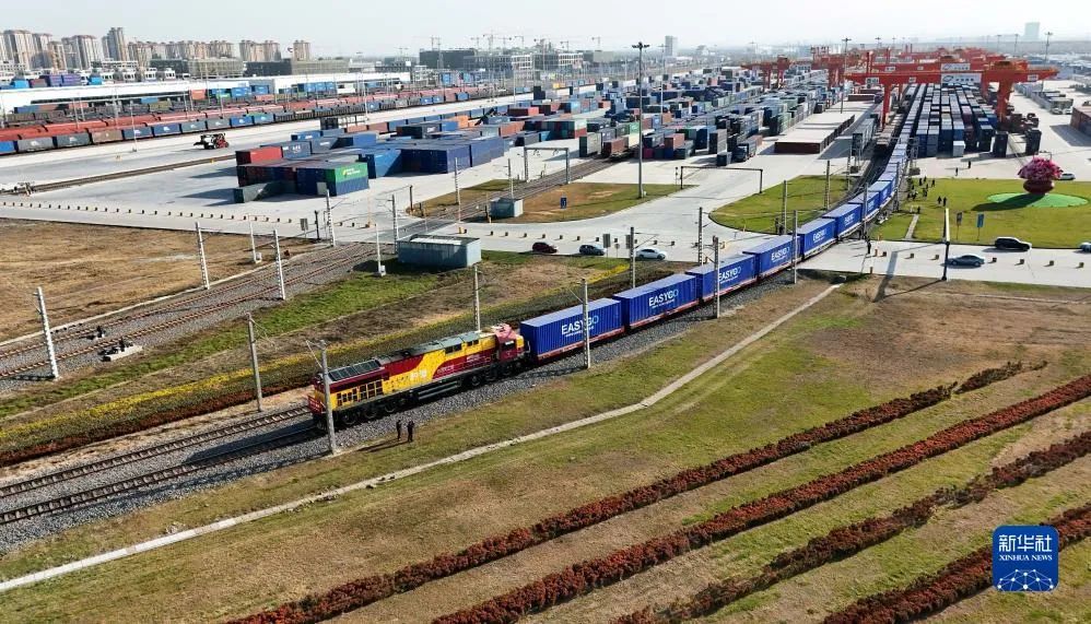 ▲ 11月28日,X8155次中欧班列从西安国际港站驶出(无人机照片)。新华社记者 邹竞一 摄
